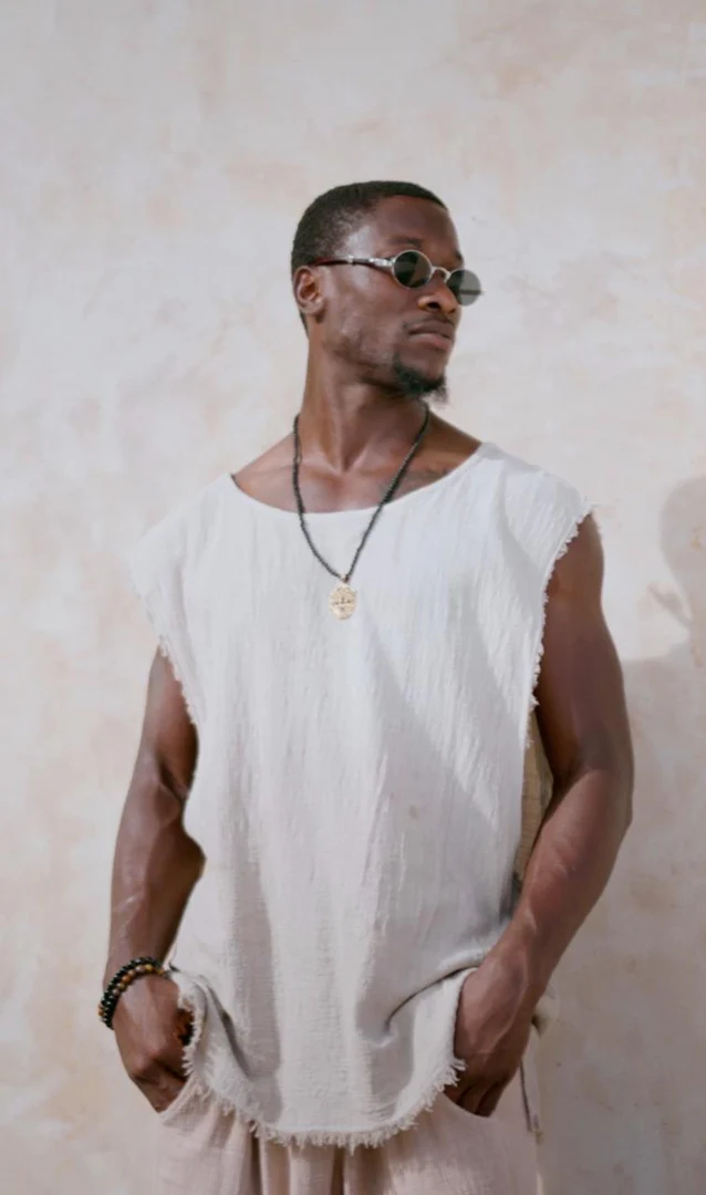 Its relaxed sleeveless silhouette is elevated by raw, frayed edges that celebrate the beauty of imperfection and artisanal craft. Rugged yet refined, the Aiden tank carries the essence of slow fashion, honoring traditional weaving techniques while offering a timeless piece that adapts to both casual days and elevated evenings.
